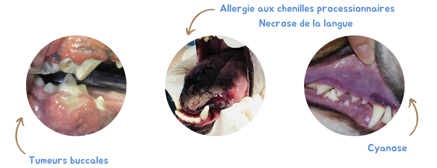 • cyanose : l'assombrissement des muqueuses (langue, gencives) est dû à une faible oxygénation du sang, la cyanose est liée à une condition primaire telle qu'une insuffisance cardiaque, une affection respiratoire ou une obstruction des conduits respiratoires, elle est une urgence médicale,